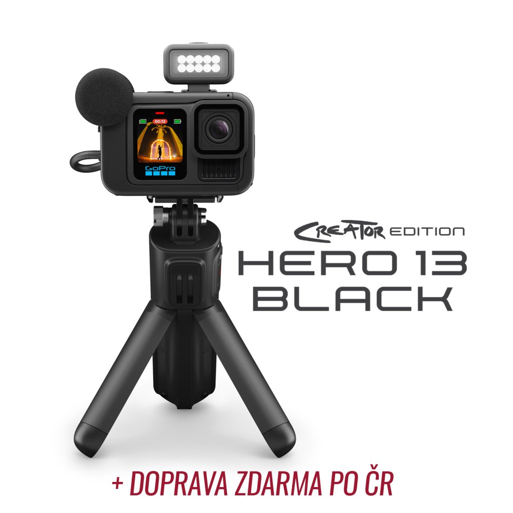 HERO13 Black Creator Edition je výkonná univerzální sada pro snímání obsahu, která umožňuje vlogovat, filmovat a vysílat živé přenosy snáz než kdykoli dřív. Obsahuje kameru HERO13 Black s nejlepším 5,3K60 videem ve své třídě a oceňovanou stabilizací videa HyperSmooth 6.0.