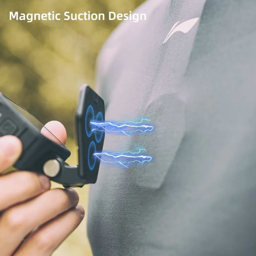 - Magnetický držák lze použít přes oblečení, batohy nebo přímo připevnit na železné povrchy, ledničky atd.